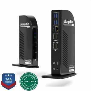 The unique display configuration on Plugable's UD-3900C4 utilizes DisplayLink technology to deliver on displays one and two. On displays three and four, tap into the power of Multi-Stream Transport (MST) Alt Mode. All four screens have resolutions up to 1080p @ 60Hz. Also works as a triple display docking station. Featuring a USB-C port with 20W charging, and 4x USB 3.0 ports for your legacy devices-all capable of data transfer speeds up to 5Gbps. It also has room for extra storage or a convenient way to download pictures through the onboard SD card reader. With 96W charging for your laptop, an Ethernet port, a 3.5mm audio-out jack, and a 3.5mm audio-in jack. The UD-3900C4 is TAA compliant.