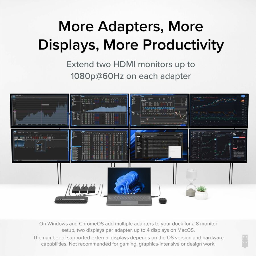 - Expand Your Workspace with Multiple Monitors: The UGA-HDMI-2S not only allows two additional displays, but also allows you to customize your setup further with the options for a quad or triple display by combining the adapter with a single USB-C dock. Windows and ChromeOS users can use this adapter with an existing docking station to support up to eight 1920x1080 (HD) displays when using multiple adapters (two 1080p displays per adapter). For macOS 10.14 or later, up to 2 adapters can be used to connect up to 4 monitors.