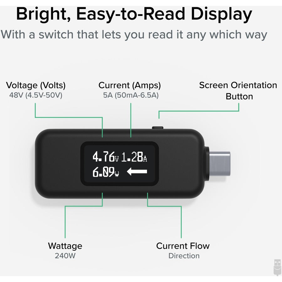 - At a Glance-USB C Tester monitors USB-C power and charging up to 240W. Measure voltage and amperage. Visualize the directional flow of electrical current. Updated OLED display is brighter and easier to read. New orientation button lets you flip the screen 180 degrees