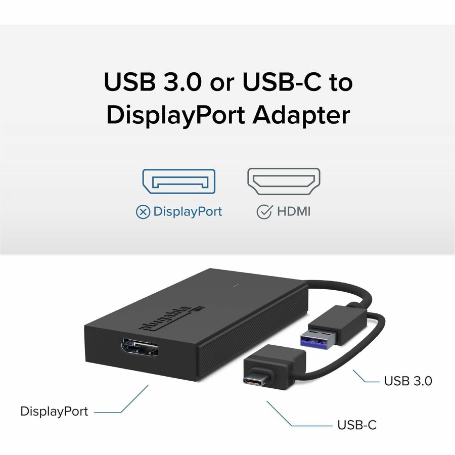 Extend Your Display - The Fast and Simple Way. "There's no shortage of options when it comes to adding screens to your laptop, and that's where things can get complicated (and expensive). The Plugable USB 3.0 and USB C to DisplayPort monitor adapter (UGA-DP-S) keeps things simple. A one plug solution that adds one DisplayPort port to your computer, the UGA-DP-S leaves your other ports open for peripherals. And because this USB A to DisplayPort adapter has a single function, it's a lot more affordable than a docking station. Extend or Mirror 4 Screens. With the UGA-DP-S adding an extra display is just the start. Combining multiple USB to DisplayPort Adapters makes it possible to add up to 8 monitors on Windows computers and up to 4 monitors on macOS computers. Quad HD. Add a 2560x1440p @ 60hz Quad HD monitor through a USB 3.0 port, USB-C, or even a Thunderbolt port. This USB-C to DisplayPort adapter supports seamless connectivity for crystal-clear visuals and reliable performance. Connection Simplicity. A hybrid 2-in-1 cable means you don't have to choose between a USB Type A and USB Type C to DisplayPort adapter picking an adapter that matches your computer. The UGA-HDMI-S works with the ports you have now, and the ports you'll have on your next computer-USB 3.0, USB-C, USB4, even Thunderbolt. Its compact design makes this USB C to DisplayPort adapter as portable as your laptop. This USB A to DisplayPort adapter ensures you always have the right connection for your devices. For Best Compatibility. "Silicon Motion is a versatile software that enables you to be more productive by adding additional displays through USB 3.0, USB-C, or Thunderbolt ports on your computer. SMI drivers on Windows will automatically install through Windows Updates. SMI macOS InstantView driver download and installation is required for MAC. This USB to DisplayPort converter is the perfect solution for extending your display setup with ease and affordability.