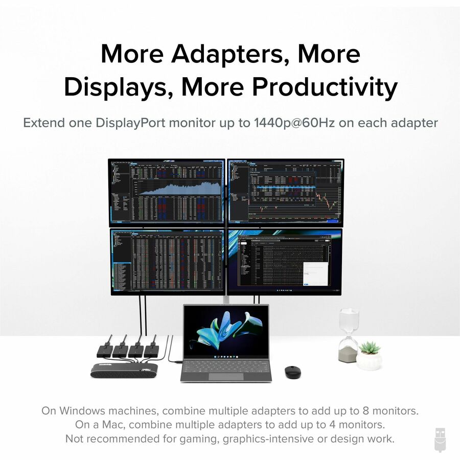 - Expand Your Workspace with Multiple Monitors: This Display Port to USB Adapter not only allows one additional display, but also offers Windows and ChromeOS users to use this adapter with an existing docking station to support up to eight 2560x1440 (HD) displays using multiple adapters. Customize your setup further with the options for an additional dual display by combining it with a single USB-C dock. (one 1440p display per adapter, up to 4 on macOS)