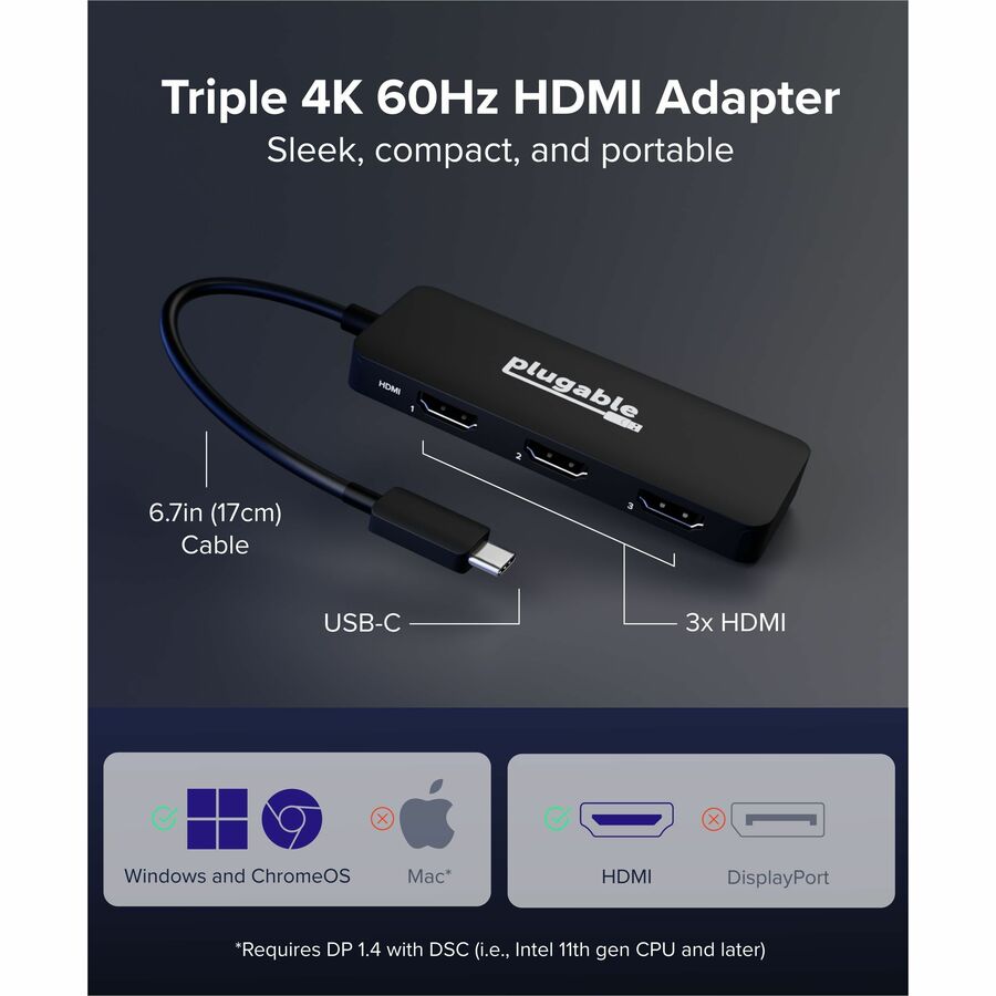 Plugable USB C to HDMI Multi Monitor Adapter - Triple 4K60 Displays - Driverless MST Hub for Windows, Chrome OS, USB-C, Thunderbolt, USB4 Laptops