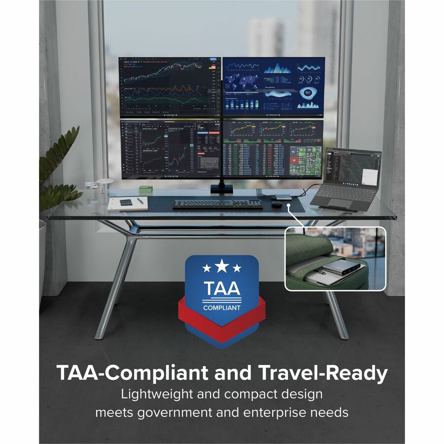 - Quad Display at a Glance: The TAA-compliant, travel-ready Plugable DisplayLink Adapter (USBC-7400H4) connects 4x 4K 60Hz HDMI displays to a USB-C port. It offers 100W pass-through Power Delivery charging, but it can also be powered the host computer, and it's incredibly compatible