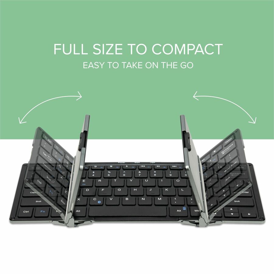 - Going out into the world? Take along the BT-KEY3XL, the full-size Bluetooth keyboard. Tri-fold design flips out to 11.5 inches when you need it, folds away when you don't. Quick charge battery lasts weeks, and it's compatible with just about anything.