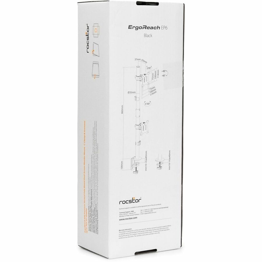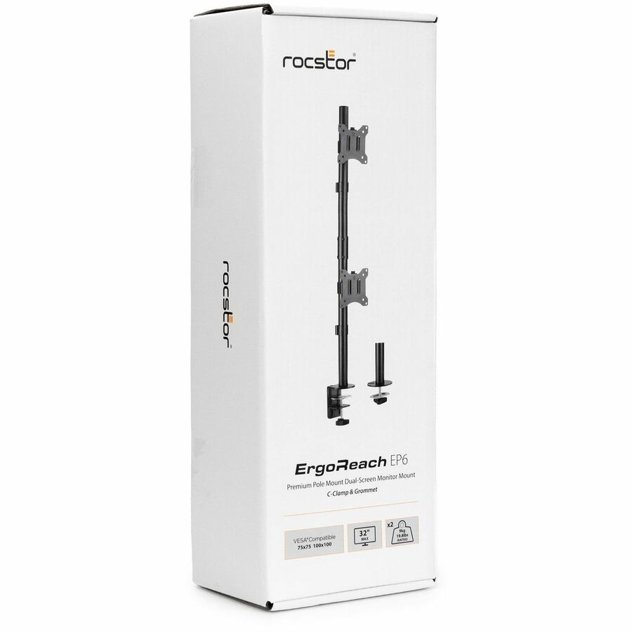 Rocstor ErgoReach EP6 Premium Dual Screen Monitor Vertical Mount is an ultimate solution to optimize your workspace and enhance productivity while maintaining a clean and organized work environment. This innovative mount allows you to securely position two monitors, each ranging from 17" to 32" , in a vertical orientation on a single base, creating a refined and efficient workspace. With a substantial weight capacity of 9kg (19.8lbs) per screen, it provides you two mounting options including both desk clamp and grommet for seamless integration into a variety of workspace configurations. Rocstor EP6 offers a tilt range of ±45° and swivel range of +90° to -90°, enabling you to easily customize your viewing angle to reduce eye strain and maximize comfort.