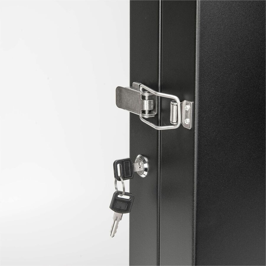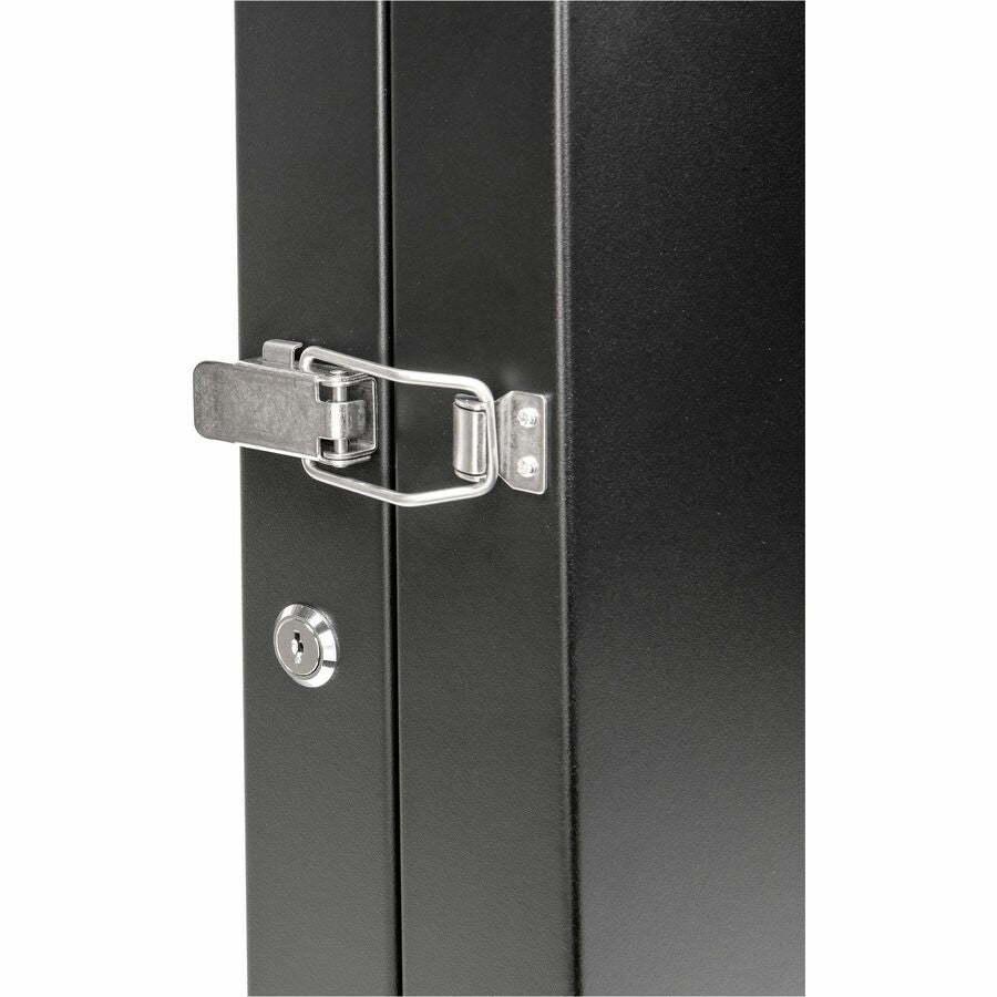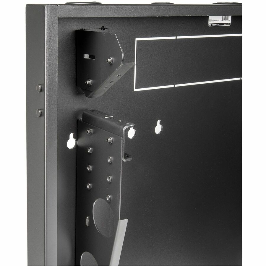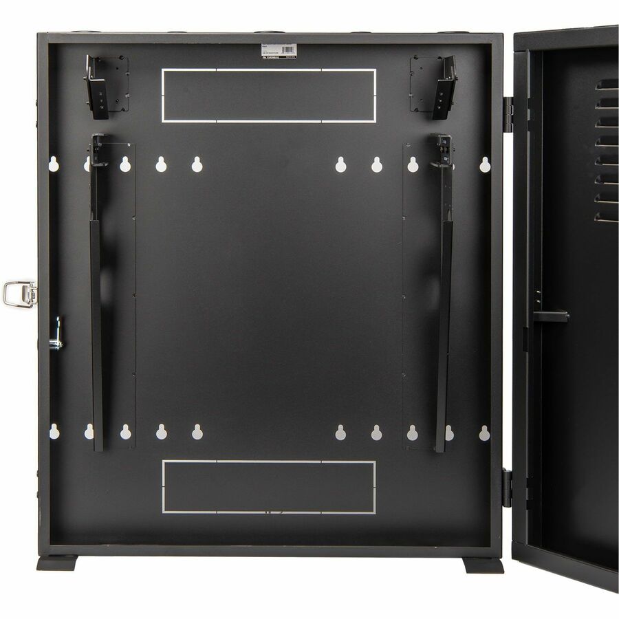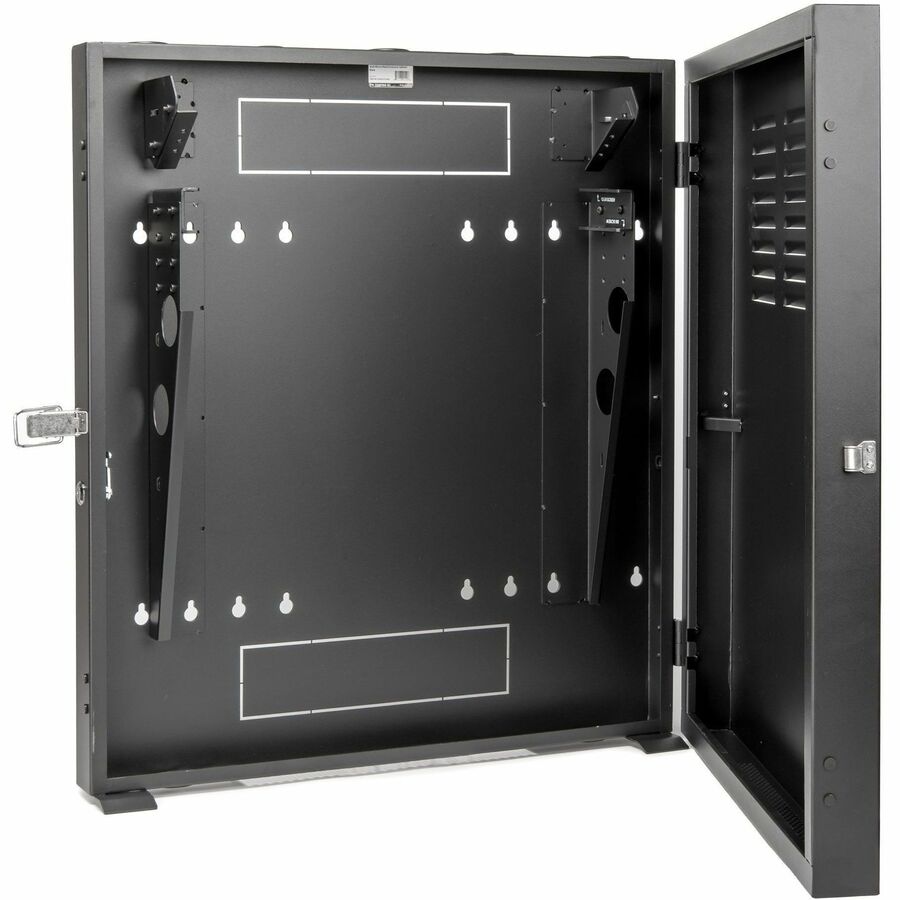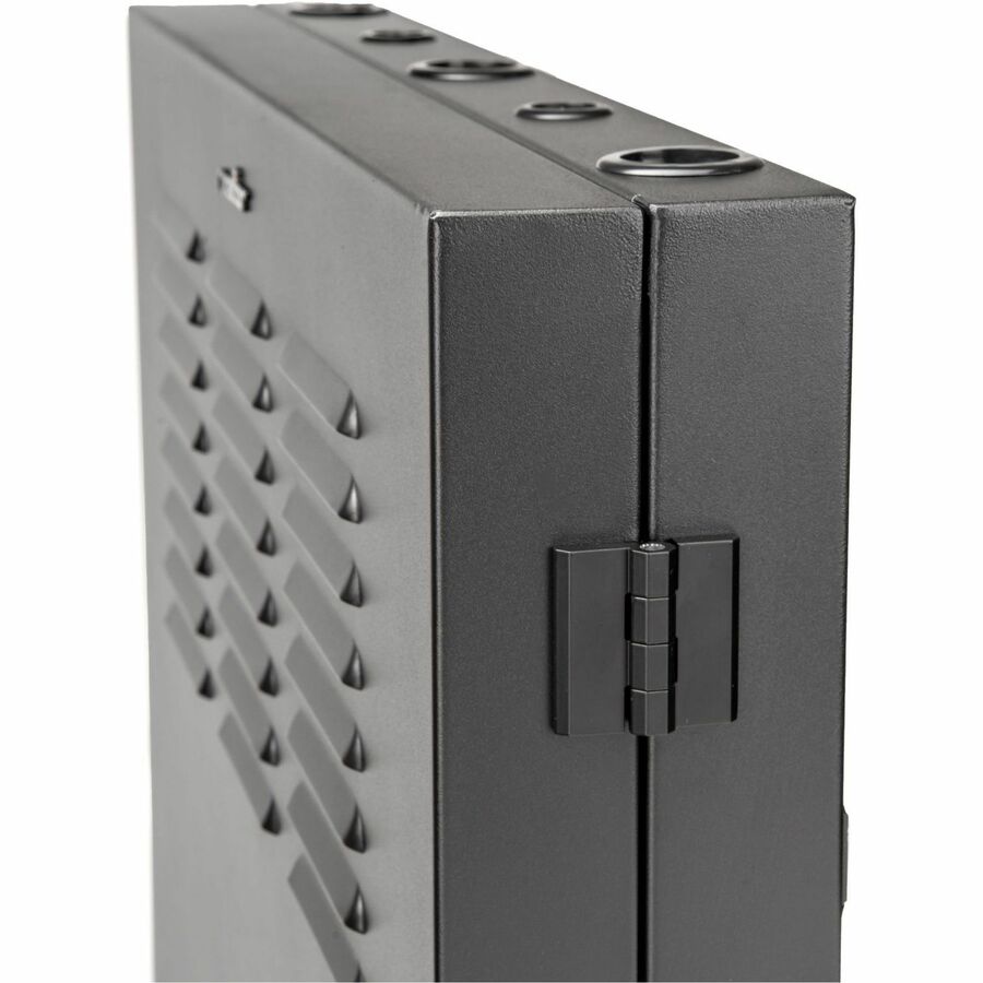 This low-profile cabinet mounts vertically, extending less than five inches from the wall, while accommodating equipment up to 20 inches deep. It offers 2U of rack space in the primary mounting area and includes an additional slide-out 1U mounting bracket at the top for patch panels up to 2.5 inches deep. The secure locking front door helps prevent unauthorized access, damage, or theft. The vented design ensures adequate airflow to keep equipment cool, and the reversible door can open to the left or right for added convenience.