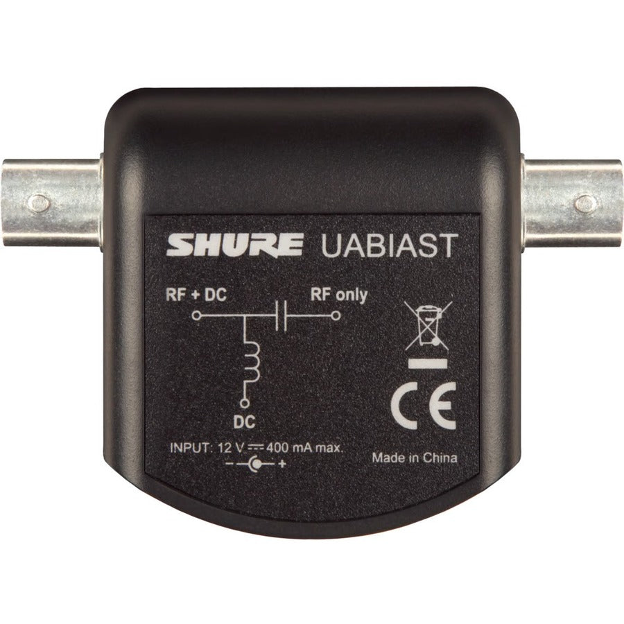 The Shure UABIAST is an in-line adapter that provides 12V DC Bias power to an active antenna or in-line accessory when a receiver's antenna input jack does not provide the necessary power. The UABIAST receives power from a wall outlet using a Shure PS24 power supply (included), and passes the RF signal while supplying power to an active antenna or other in-line device. It is capable of supplying power to three in-line amplifiers (Shure UA834), or two in-line amplifiers and one active antenna (Shure UA874).