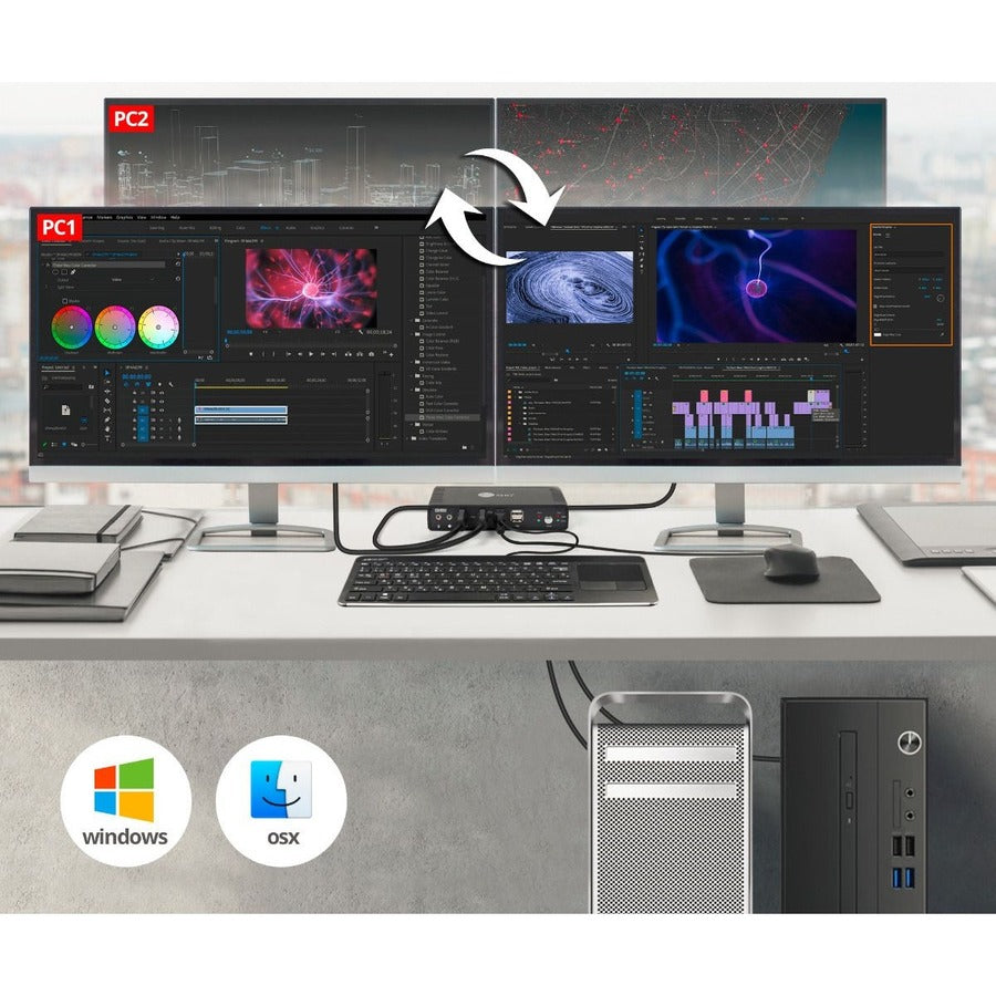 Control two 4K HDMI or DisplayPort computers with one keyboard, mouse, with microphone input and stereo audio output and dual HDMI outputs for extended, mirror, primary dual display capabilities