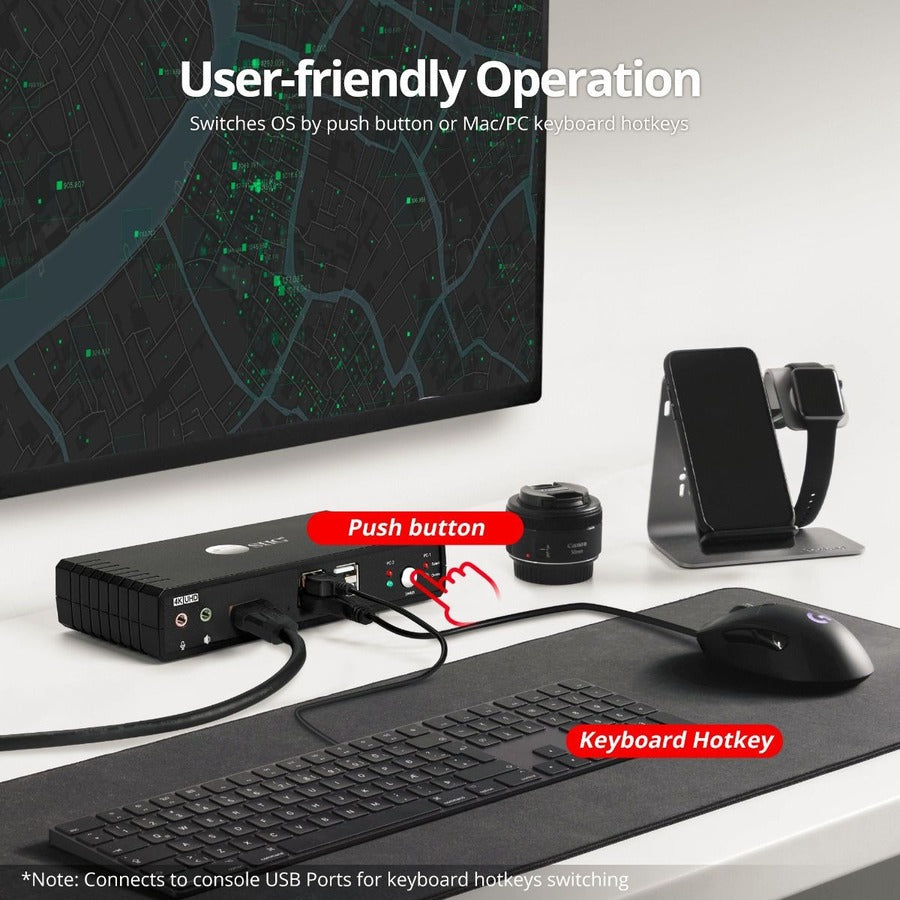 • Device Controls - Allows you to control two 4K HDMI computers with one USB keyboard, USB Mouse, and HDMI display, adds USB Hub, microphone, stereo speaker/headphone connections