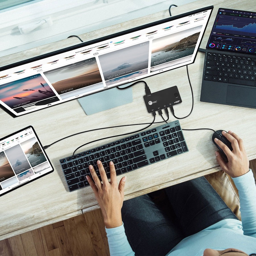 Easily control 2 USB-C DP Alt mode computers/tablets and switch a 4K HDMI display/monitor with one set of keyboard & mouse, a sturdy design to switching computers, and save your workspace for increased efficiently