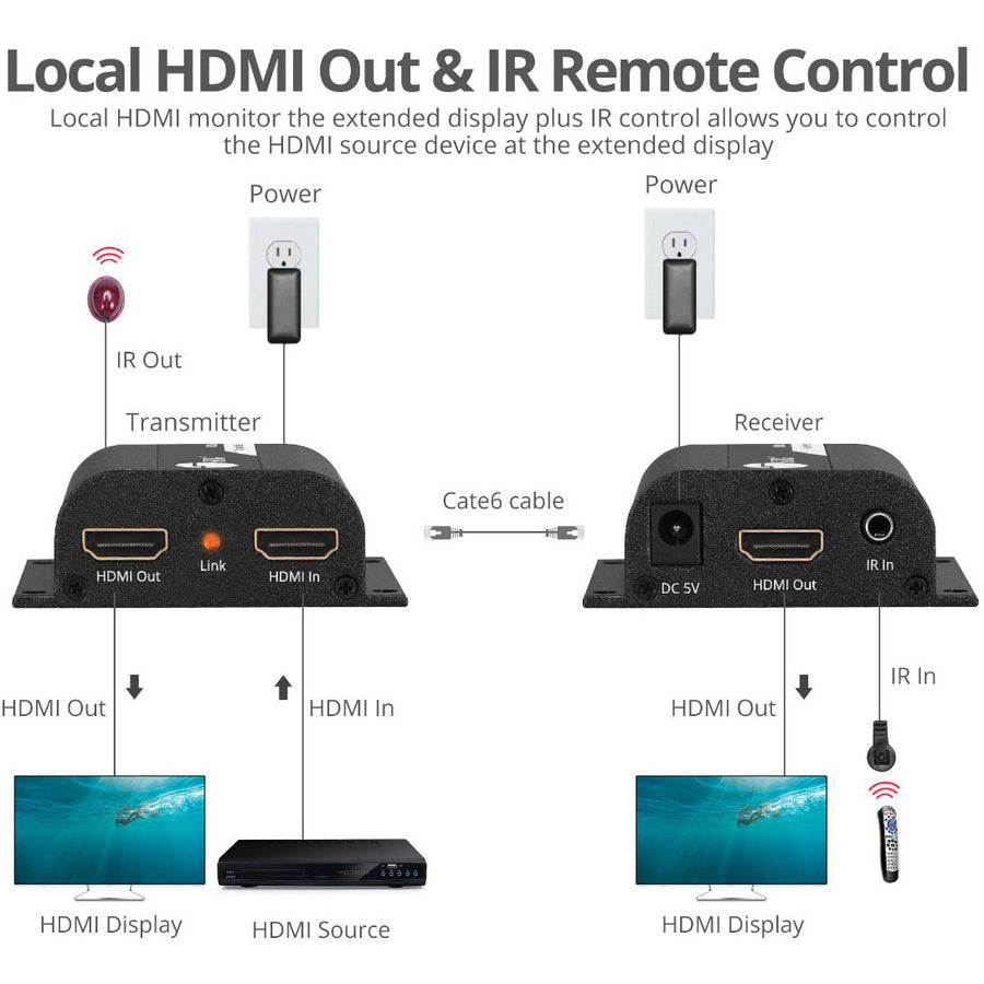 • IR remote control through CAT5e/6 allows you to control the HDMI source device at the extended display location