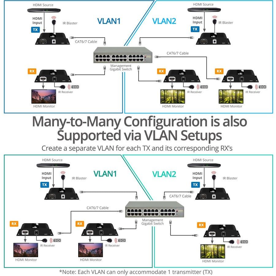 - Direct 1-to-1 connection, 1-to-many through unmanaged Gigabit network switches, or many-to-many via VLAN through a Smart Ethernet Switch. With HDBitT transport protocol, you can connect up to 255 Receivers* per Transmitter to not only extend but split HDMI signals to multiple displays. **The kit (CE-H25D11-S2) and additional Receivers (CE-H25E11-S2) are sold separately