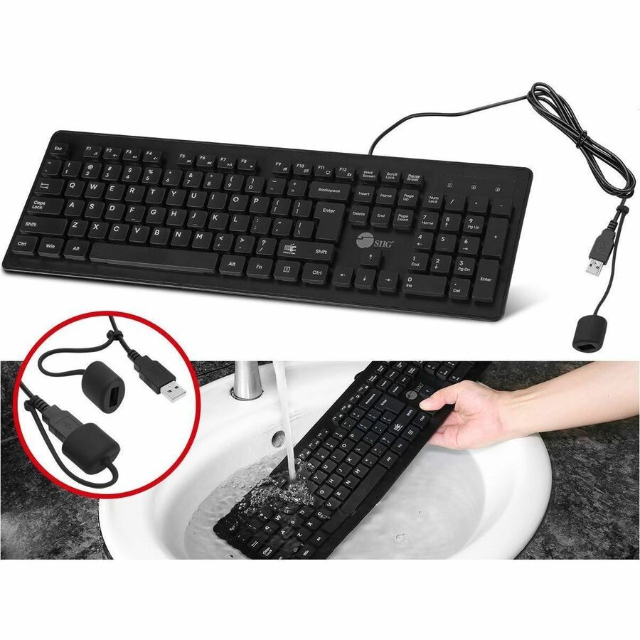 SIIG Industrial Grade Washable & Dustproof USB Multimedia Keyboard - Industrial Grade Washable & Dustproof USB Multimedia Keyboard, IP68, Fully Sealed, 104 Keys, Quiet Keycaps, Non-slip, Plug-n-play, for Window desktop or notebook PC? Cable Connectivity - USB Type A Interface - 104 Key - Rugged - Notebook - PC - Black