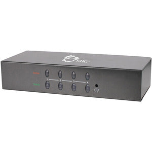 SIIG's 4x1 VGA & Audio Switch with IR allows you to switch between four computers to share a VGA monitor and a set of speakers. It supports up to 1920 x 1440 resolution, VGA, SVGA, XGA, UXGA, and multi-sync monitors, analog stereo audio (via 3.5mm audio jacks), and video bandwidth of up to 300 MHz with operating distance up to 50M (164 ft).