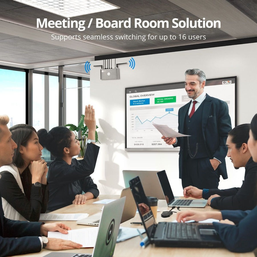 Share up to 16 devices wirelessly with dual screen main display, 4K resolution, perfect for meeting and boardroom presentation