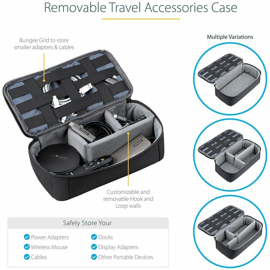 The removable accessories case (10.5in x 5.25in x 3in) is stored in its own compartment in the backpack and was designed to be easily accessed using the lower side pocket of the backpack so you don't have to search through or displace any items in your bag. It is designed with the same ballistic nylon as the backpack to ensure durability. The hook and loop dividers can be positioned for added protection around your accessories, and the bungee grid is perfect for storing your smaller devices such as tools, IT equipment, and cables. Once the case is removed, the main compartment of the laptop bag can be extended (by collapsing the hook and loop tied wall) to provide you with more room to store any other essentials required for a short or long-term trip.