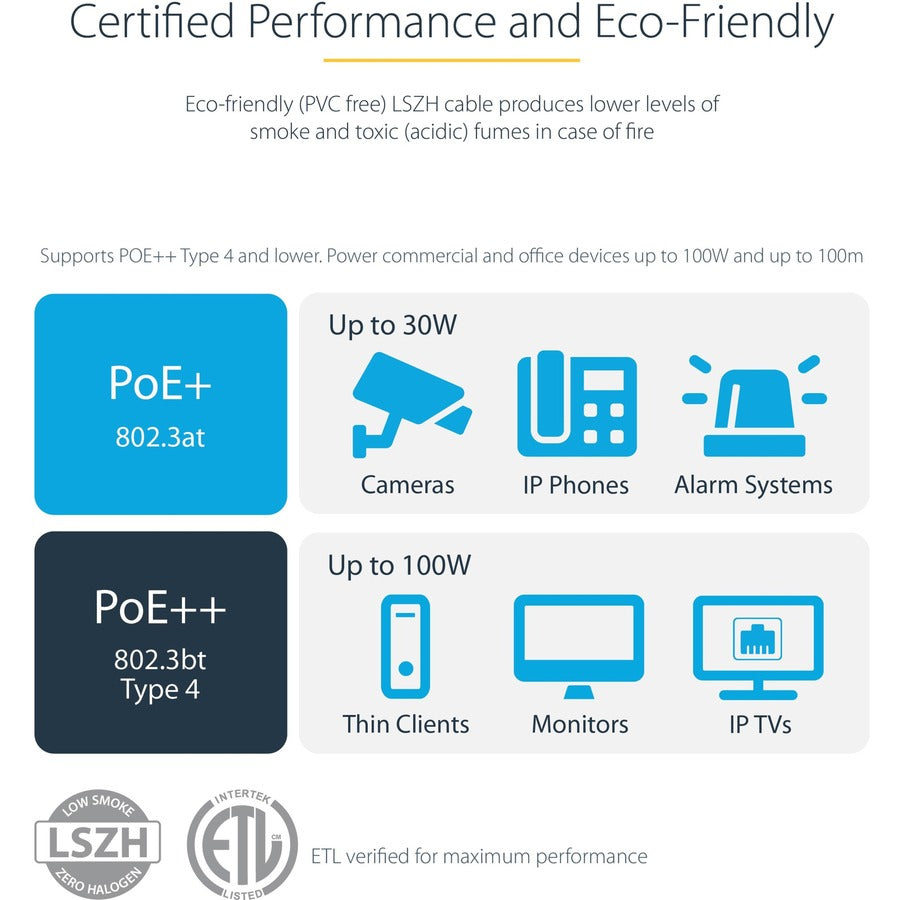 • LSZH CABLE WITH 100W PoE: Low Smoke Zero Halogen Ethernet patch cord with 24 AWG cable, stranded copper conductors supports various PoE devices up to 100W PoE++; Complies with IEEE 802.3bt type 4; Supports Cat5e & earlier standards