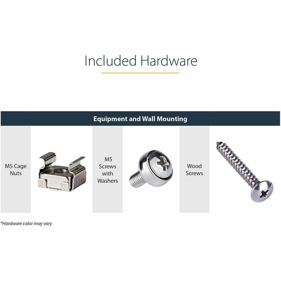 The wall rack is constructed of solid steel to ensure a sturdy and safe mounting solution for your expensive, mission-critical equipment. Also, because the wall mounting holes are positioned 16"apart, it exactly matches standard drywall construction framework to ensure simple and secure wall-stud anchoring. Cage nuts and screws are also included with the wall-mount bracket, to save you the hassle of sourcing separate mounting hardware.