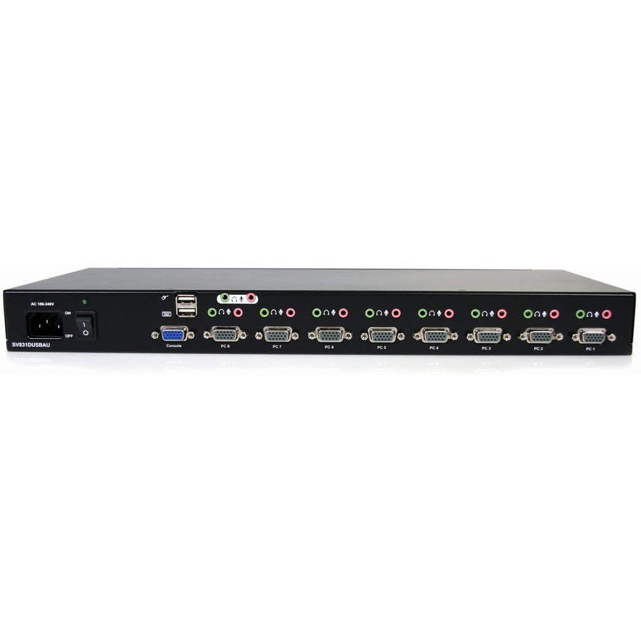 The SV831DUSBAU 8 Port Rack Mount USB VGA KVM Switch (with Audio Cables Included) allows you to control up to 8 USB computers using a single keyboard, mouse and monitor, and features Audio and Microphone ports to switch between audio signals as well as PC ports.
