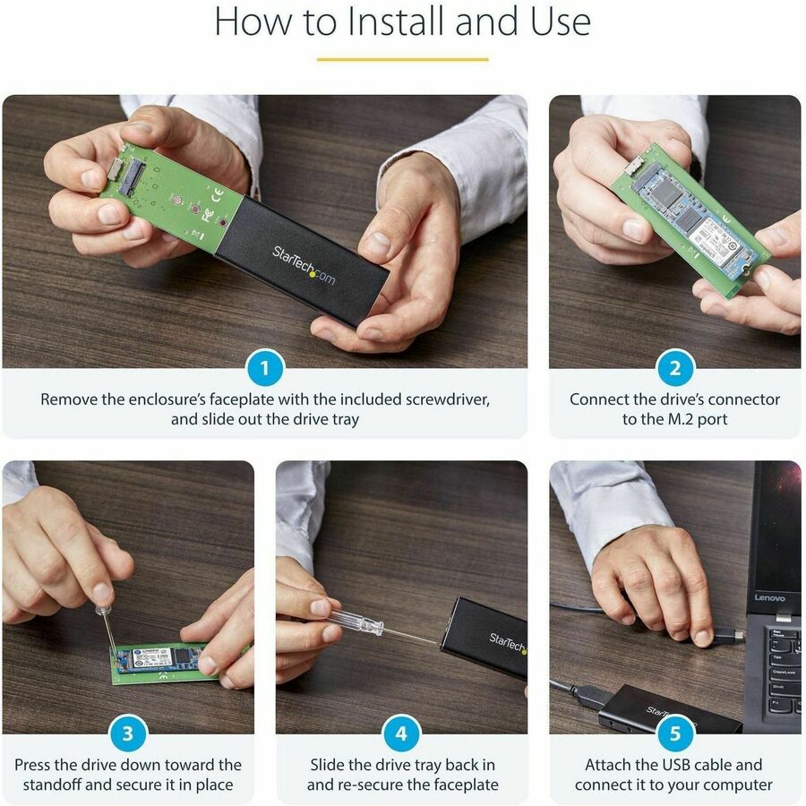 This compact M.2 SATA SSD enclosure lets you add highly portable data storage to any laptop or computer with a USB-C™ port - such as MacBook, Chromebook Pixel™, Dell™ XPS laptops, and many others. It turns your SATA M.2 drive into a high-speed storage solution over a USB 3.1 Gen 2 connection, at up to 10Gbps throughput.