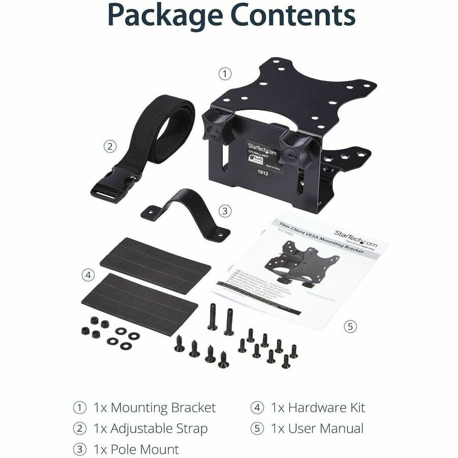 This adjustable mount is ideal for holding an Intel® NUC, Mac Mini, most small CPUs, thin clients, docking stations, or USB hubs that fit within the width adjustability of the mount (.7" to 2.8" / 17 mm to 70 mm). The mount can support up to 11 lb. (5 kg). It also features an adjustable strap to help keep your devices secure, and rubber pads to secure products with non-parallel surfaces.