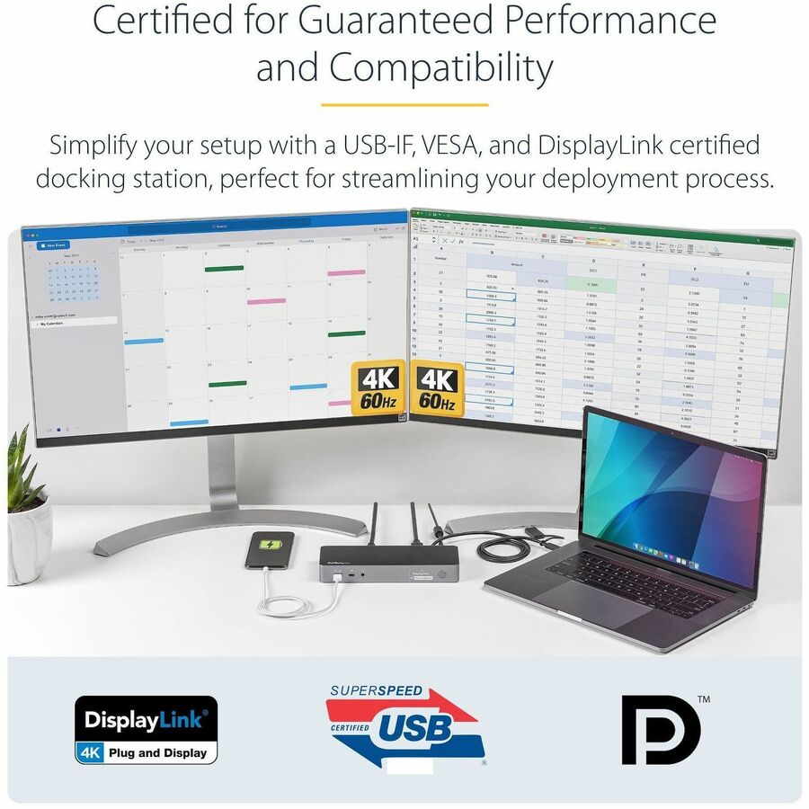 This docking station is fully certified to meet top industry standards for USB-IF (USB 3.1 Gen 1, USB Type-C and Power Delivery), VESA DisplayPort and DisplayLink (video connections) certification to guarantee the highest quality, reliability, and compatibility.