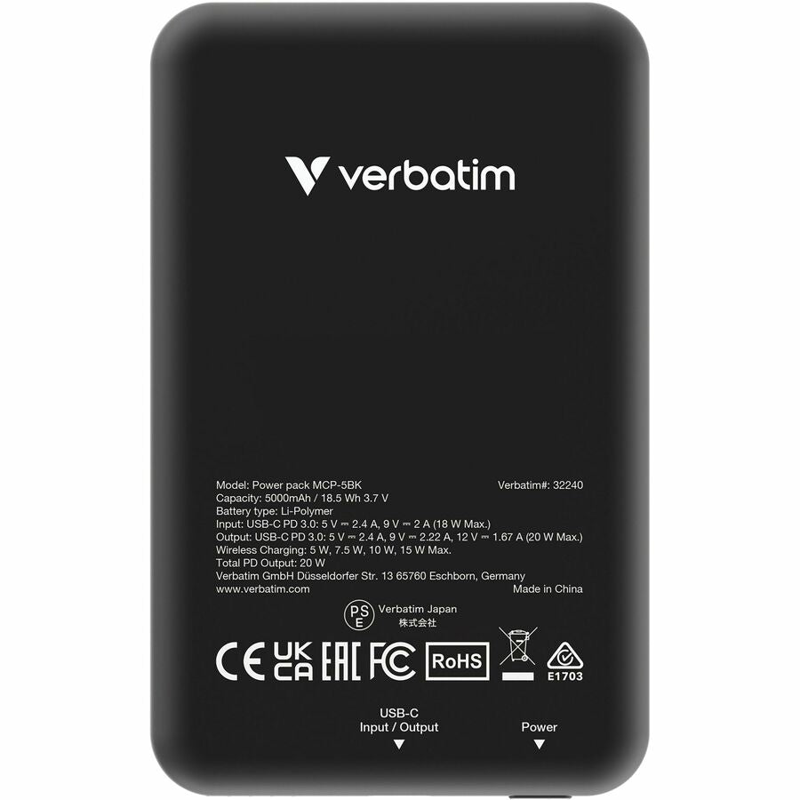 The Verbatim Charge 'n' Go 5000mAh Power Bank features a super-slim body, delivering optimal portability without sacrificing performance. Its advanced features include 15W magnetic wireless charging, Power Delivery (PD) 20W capabilities, and a versatile bidirectional Type-C port, ensuring swift and efficient charging. The LED indicator provides users with easy-to-monitor power status and the additional metal ring can be attached to the phone or phone case to provide a strong magnetic hold if required. Designed for versatility, Verbatim Power Banks are perfect companions for travel, commuting, events, and outdoor activities, offering a dependable on-the-go energy solution.