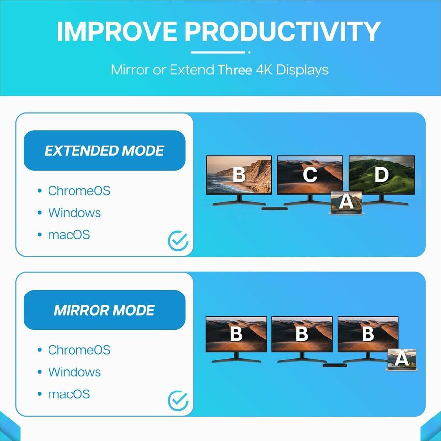 - Connect ThreeExternal Displays - 2 Displays are powered by DisplayLink,1x HDMI powered by DisplayPort over USB-C.